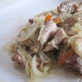 ПЪРЖЕНИ ЖУЛИЕНИ ОТ СВИНСКО МЕСО ПЪЛНЕНИ ЧУШКИ С ОРИЗ И КАЙМА САЛАТА ОТ КАРТОФИ ГЪБИ И ПРАЗ КЮФТЕТА ОТ СТАР КРОМИД ЛУК